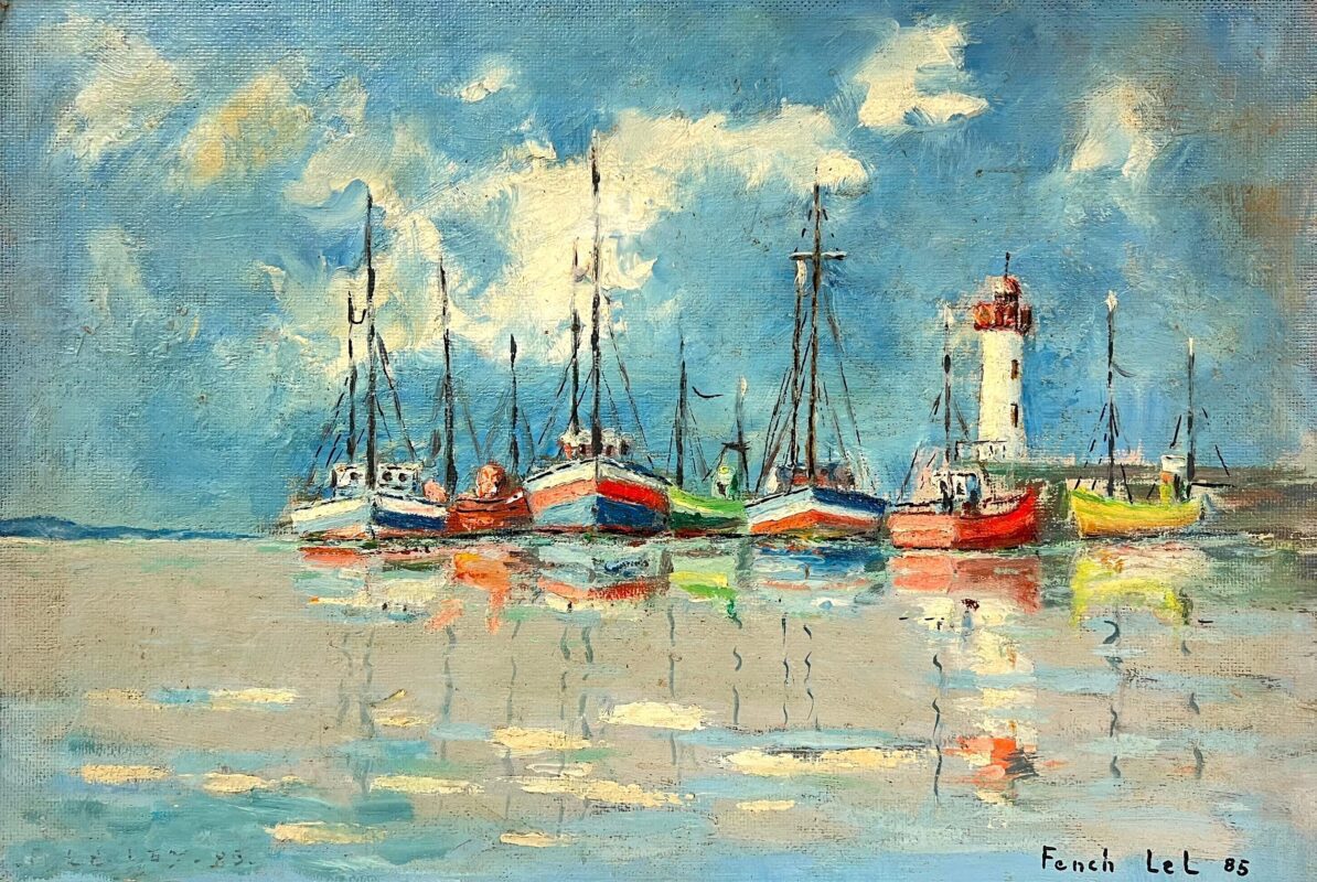 Fishing Boats and Lighthouse — Oil on Board, Signed by Fanch Lel