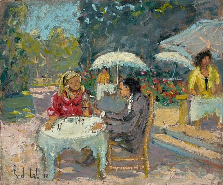 Elegant Couple at a Garden Café — Oil on Board, Signed by Fanch Lel