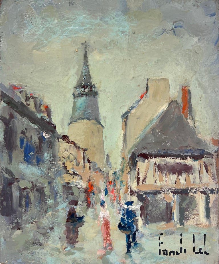 Figures in Dinan, Brittany — Oil on Board, Signed by Fanch Lel