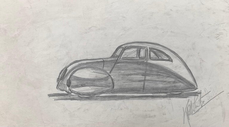 Medium: Pencil on paper Size: 5.75 inches (height) x 10.5 inches (width) Signed: Yes Condition: Good condition, slight age-related wear around the edges. Provenance: From the artist’s estate Description: This pencil drawing by K. B. White features a detailed rendering of the 1938 Talbot-Lago T150-C SS Teardrop Coupé, one of the most iconic and luxurious cars of the Art Deco era. The Talbot-Lago, known for its aerodynamic teardrop shape and sleek, streamlined design, is beautifully captured in this artwork. The vehicle’s flowing lines and distinctive curves are emphasized, highlighting the elegant and innovative styling that made the Talbot-Lago a standout in automotive history. K. B. White’s illustration showcases his skill in capturing the essence of classic automotive design, particularly from the 1930s. The drawing not only reflects the luxury and sophistication of the Talbot-Lago but also the era’s emphasis on aerodynamics and futuristic aesthetics. This piece is an excellent addition for collectors interested in vintage car art or the history of automotive design. The artwork is in good condition, with slight edge wear that adds to its character and authenticity. For more any more information please do contact us with any questions you may have. Thank you.