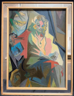 Description: This striking painting showcases a captivating portrait of a woman rendered in a dynamic, abstract style. With angular forms, bold lines, and a rich interplay of colors, the artist creates a compelling composition that blends cubist influences with a modern aesthetic. The seated figure is adorned in flowing garments of soft greens, vibrant reds, and subtle pinks, accentuated by touches of gold in her cascading curls. Her poised expression and graceful posture exude an enigmatic allure.