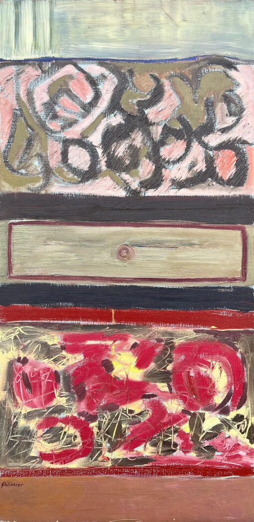 Abstract Expressionist Composition by Gilbert Pelissier (French born 1924) signed, inscribed verso dated 1963-1965 oil painting on canvas, unframed canvas size: 39 x 20 inches condition: overall very good, a few minor surface scuffs from being stored in the artists studio provenance: all the paintings we have by this artist have come from the artists estate, Paris, France. Description: This striking abstract painting by Pélissier explores the interplay of layered textures and bold color blocks. The composition is divided into distinct horizontal bands, each with its own unique patterns and color schemes. From organic, swirling shapes in muted earth tones to bold, energetic strokes in vibrant reds, the artwork conveys a sense of depth and rhythm. A central beige section with a single, subtle circular element adds a grounded focal point, while the upper and lower sections provide movement and contrast. Perfect for collectors of modern abstract art, this piece exemplifies Pélissier’s mastery in blending texture with color, resulting in a work that captivates and invites contemplation.