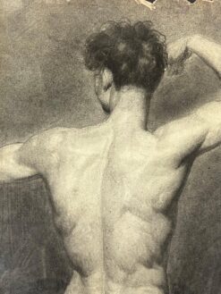 This striking charcoal drawing captures a detailed and anatomically precise study of a male figure’s back, rendered in the classical academic style. The artist demonstrates exceptional skill in capturing the intricate musculature and contours of the human form, emphasizing strength and grace with masterful shading and delicate linework.