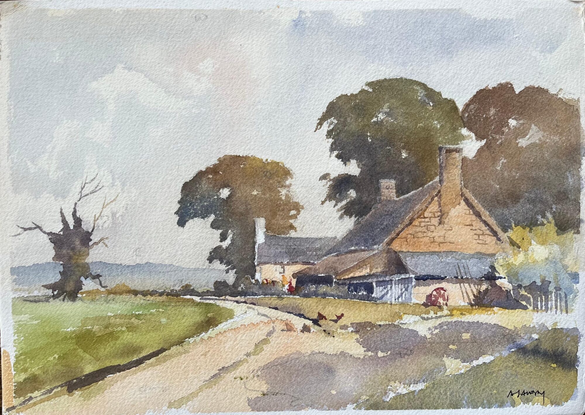 Title: British Impressionist Watercolor of a Rustic Farmhouse Scene and Chickens By Anthony Avery (British 1946-2023) Original watercolor on artists paper, unframed Signed: Yes Dimensions: 11 x 15.25 inches (Height x Width) Condition: Good, with some minor signs of aging. Provenance: From a large collection of this artists work, held in England. Description: This charming British Impressionist watercolor by A.J. Avery captures a rustic farmhouse nestled in a peaceful rural setting. The composition features a winding dirt path leading to a cluster of farm buildings, with chickens dotting the foreground and vibrant greenery in the surrounding landscape. The warm, golden tones of the farmhouse contrast beautifully with the soft blues and greens of the distant hills and open sky. The artist skillfully employs loose brushwork and washes to convey the timeless serenity of the countryside, while subtle details like the weathered stonework and gentle play of light and shadow add depth and character to the piece. The inclusion of mature trees and a bare tree silhouette enhances the sense of place and natural beauty. This evocative painting is ideal for collectors of rural landscapes and traditional farm scenes, offering a nostalgic glimpse into the charm of pastoral life.