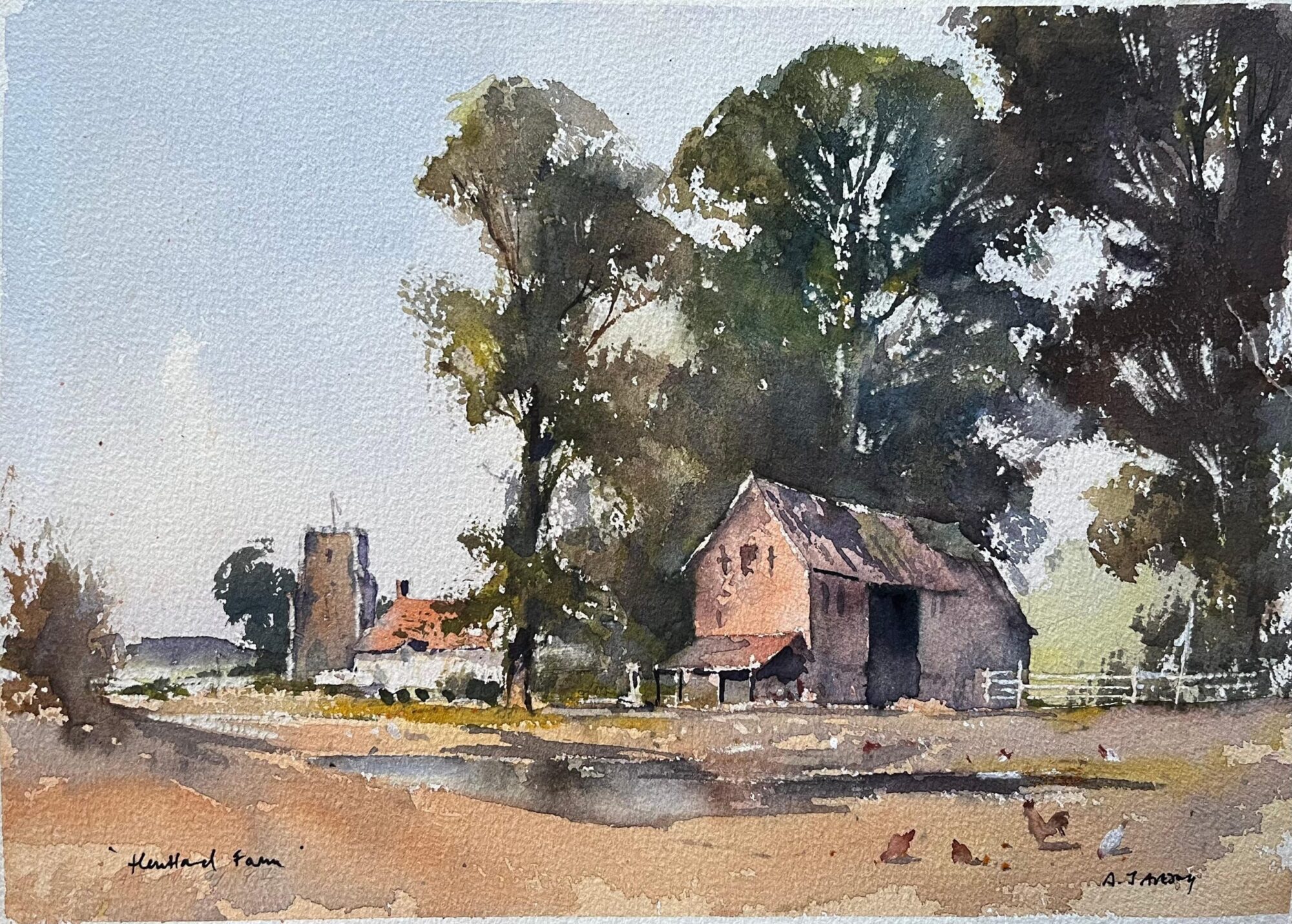 Title: British Impressionist Watercolor of Kentfield Farm, with Church and Chickens By Anthony Avery (British 1946-2023) Original watercolor on artists paper, unframed Signed: Yes Dimensions: 11 x 15.25 inches (Height x Width) Condition: Good, with some minor signs of aging. Provenance: From a large collection of this artists work, held in England. Description: This evocative watercolor by Anthony Avery captures the rural charm of “Kentfield Farm” with exquisite detail and atmosphere. The composition features a weathered barn framed by tall trees, with a distant view of a church tower and a quaint farmhouse. Chickens dot the foreground, adding a lively touch to the tranquil rural scene. Avery’s mastery of light and shadow brings the setting to life, with sunlight filtering through the trees and casting warm tones over the landscape. The contrast between the rustic barn and the whitewashed structures in the background emphasizes the harmony of natural and built environments. This piece showcases the artist’s deep appreciation for English pastoral life, making it a delightful addition to any collection.