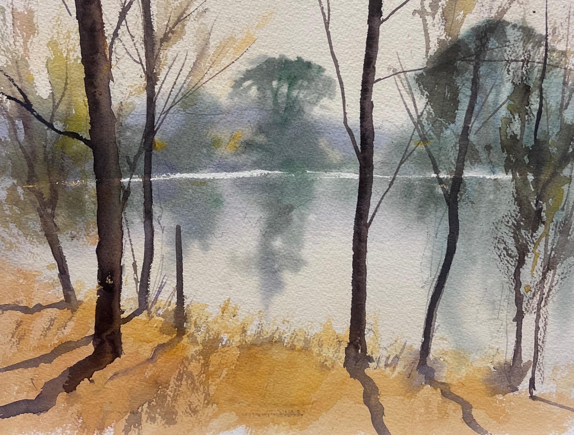 British Original Impressionist Watercolor Atmospheric Misty Lake Woodland View