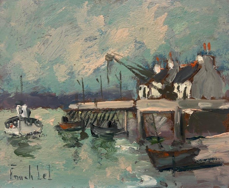 Coastal Village with Docked Boats and Waterfront Homes French Oil Painting