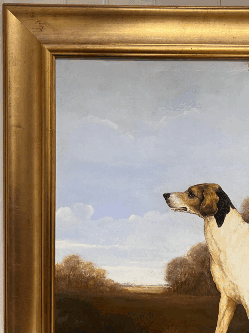 Superb quality, large scale ‘country house’ painting ideal for many interiors, depicting this beautiful hunting hound standing proudly in the English landscape. Painted in 1985 though with a nod back to the great sporting artists of the 18th/ 19th centuries.