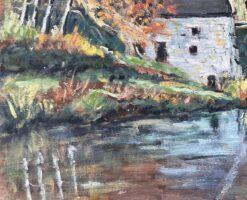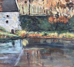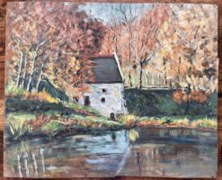 Rendered in oil on board, the work showcases Lel’s nuanced brushwork and sensitive use of colour. The trees shimmer in yellow and amber tones, contrasted against deep forest greens and the cool grey of the stone mill. Delicate reflections ripple along the water, and the layered foliage provides a rich visual rhythm across the piece.