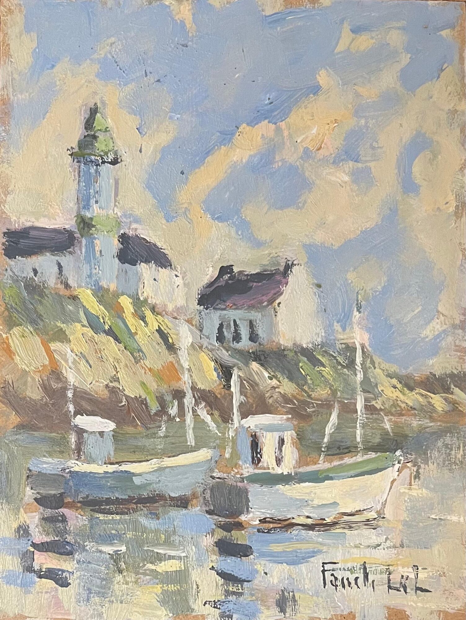 Title: French Impressionist Oil Painting of Boats and Lighthouse on a Rocky Shore By Fanch Lel (French b. 1930) Size: 9.5 x 7 inches (height x width) Signed: Yes Oil painting on board, unframed Condition: The painting is in good condition, with minor signs of aging. Provenance: All the paintings we have for sale by this artist have come from the artists estate and have had no previous owners at all. Description: This vibrant French Impressionist oil painting captures a serene coastal scene featuring several small boats anchored in calm waters, with a lighthouse standing proudly atop a grassy, rocky shoreline. The painting is characterized by soft, pastel tones and loose, expressive brushstrokes, typical of Impressionist works. The lighthouse, painted in shades of pale blue and topped with a green dome, overlooks a charming small house nestled along the ridge. The reflection of the boats and shoreline in the rippling water creates a sense of tranquility, while the sky is filled with wisps of cloud, gently illuminated by the light of the sun. Fanch Lel skillfully conveys the peaceful atmosphere of this coastal retreat, with the lively brushwork and delicate use of color making this piece a striking example of mid-20th-century French coastal painting.