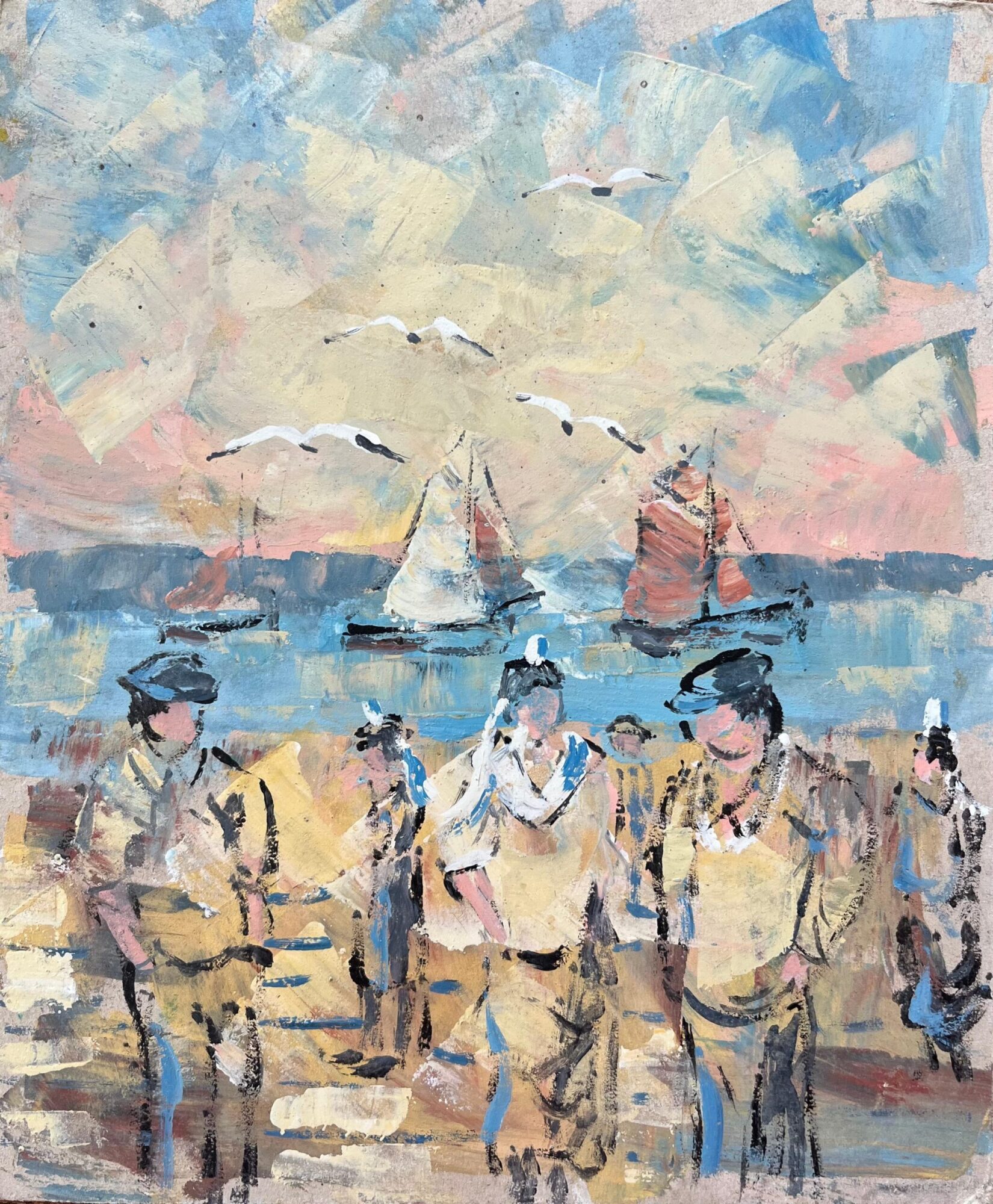 Title: French Impressionist Oil Painting of Sailors and Seagulls by the Seaside By Fanch Lel (French b. 1930) Size: 10.5 x 8.75 inches (height x width) Oil painting on board, unframed Condition: The painting is in good condition, with minor signs of aging. Provenance: All the paintings we have for sale by this artist have come from the artists estate and have had no previous owners at all. Description: This lively impressionist painting by Fanch Lel depicts a bustling seaside scene with sailors, seagulls, and sailboats set against a soft pastel sky. Figures in traditional attire stroll along the shoreline, while seagulls fly overhead, adding movement and energy to the composition. The colorful sailboats in the background enhance the maritime theme, and the artist’s use of bold, expressive brushstrokes brings depth and vibrancy to the scene. Lel’s impressionistic style and playful color palette capture the charm and vivacity of coastal life, making this piece a perfect addition for collectors who appreciate nautical scenes and seaside imagery. This painting is ideal for anyone seeking artwork that celebrates the energy and spirit of life by the sea.