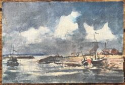 This expressive watercolor by Maurice Mazeilie captures a stormy coastal scene with boats anchored near the shore. Dark, billowing clouds dominate the sky, casting a dramatic shadow over the water and lending an air of intensity to the piece. The reflection of light on the water contrasts sharply with the moody sky, creating a sense of movement as the waves ripple towards the boats. On the right side, a figure in a red garment brings a focal point of color amidst the dark, subdued palette. Structures in the background hint at a quiet coastal settlement, adding a layer of depth and perspective. Mazeilie’s skilled brushwork and nuanced color choices make this piece a compelling exploration of nature’s power and unpredictability.