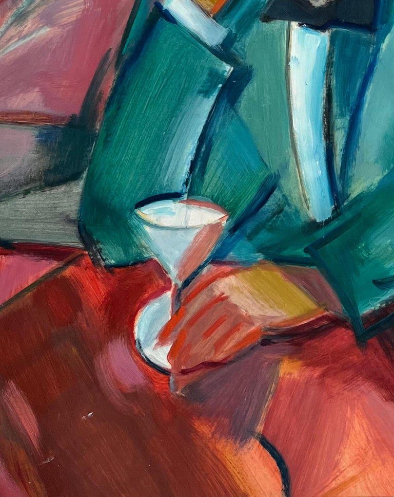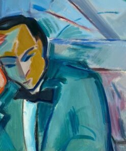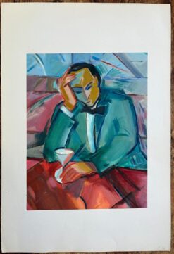Description: This original oil painting by Roland Pichard captures a contemplative moment as a well-dressed gentleman in a green jacket and bow tie rests his head in his hand, seated at a table with a martini glass. The bold and expressive brushstrokes, combined with a dynamic palette of blues, reds, and greens, create a scene full of emotion and intensity. The abstracted background hints at a vibrant interior, perhaps a bar or lounge, adding to the sense of introspection and atmosphere. Perfect for collectors drawn to figurative work with emotional depth and modernist flair, this piece is a striking example of Pichard’s artistry.
