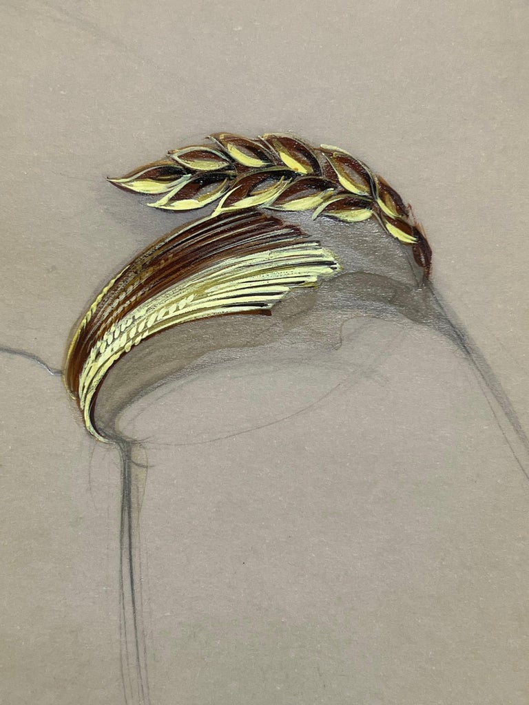 Golden Harvest: Leaf and Wheat Motif Cuff Bracelet Jewelry Design circa mid 1900-1999 by Paul Touzet (French b. 1917) original gouache painting, with pencil on tracing paper stuck on thick paper overall paper size: 9.75 x 6.25 inches tracing paper: 7 x 4 inches condition: the overall condition is very good, minor creasing to the corners/ edges, very minor staining. provenance: private collection, France We are honored to introduce to you an incredible and unique collection of original jewelry design artwork. We have over 100 similar original works – some offered as pairs, some individually. For the collector of jewelry they offer the ultimate accessory for their home. Equally, these would look stunning framed together in a jewelry or fashion store or even a vintage bistro or hotel! Discover the timeless elegance of original French vintage jewelry design artwork by the illustrious Paul Touzet, a master jeweler whose craftsmanship has left an indelible mark on the world of haute joaillerie. Born on January 12, 1917, Touzet’s journey into the art of jewelry began at the tender age of 13, training under the prestigious Mauboussin in Paris. His talent and dedication quickly set him apart, and by November 17, 1944, he had officially registered his business, soon after obtaining his hallmark—a distinctive “P.A.T. / a bicycle wheel butterfly”—on December 7, 1944. Paul Touzet’s artistry is celebrated for its collaborations with iconic houses such as Van Cleef & Arpels, Boucheron, and Sterlé, reflecting the highest standards of French luxury. His exclusive designs have graced the likes of legendary figures, including the beloved singer Charles Aznavour, for whom he crafted exquisite pieces. Touzet’s craftsmanship even reached royal circles, with bespoke tuxedo buttons personally delivered to Prince Rainier of Monaco and stunning jewelry designed for his wife, Princess Grace of Monaco (Grace Kelly). Each piece of Touzet’s original design artwork is a rare glimpse into the golden age of French jewelry, capturing the elegance, precision, and innovation that define his legacy. Own a piece of history and artistry with Paul Touzet’s vintage jewelry designs—timeless treasures that continue to enchant and inspire.