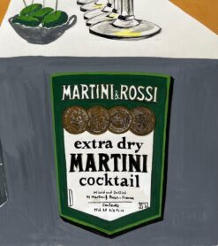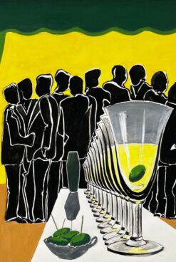 This original gouache advertising design by Guy Nicod is a vibrant and theatrical composition created for Martini & Rossi, the renowned Italian vermouth brand. Executed in bold planes of colour, the work depicts a lively cocktail party scene with a line of martini glasses extending into the distance, each filled with a golden cocktail garnished with a green olive. The repetition of the glasses creates a rhythmic perspective, leading the eye to a silhouetted crowd of guests, elegantly suggested in black and white outline.