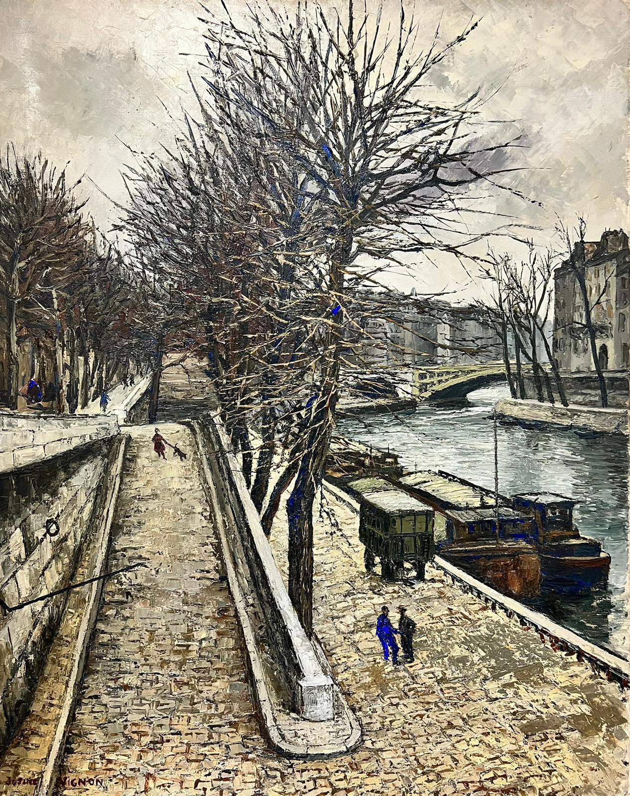 Winter in Paris signed by Josine Vignon (French 1922-2022) oil painting on canvas, unframed inscribed verso canvas: 36 x 29 inches very good condition provenance: the artists estate, Paris Josine Vignon (1922-2022) was a French artist living on the Rue Beautreillis in the Marais district of Paris. She painted with a beautiful style, largely influenced by the Impressionist and Post Impressionist techniques, but adding her own distinctive style and technique to each painting. Vignon’s works carry tremendous energy and enthusiasm, often painted with very thick impasto oil creating a rich and diverse texture, as well as painting with a tremendous palette range of vibrant and joyful colors. She captured her home city of Paris, as well as Provence and the beauty of the surrounding countryside. We consider her one of the most talented and significant ‘undiscovered’ artists of her time.